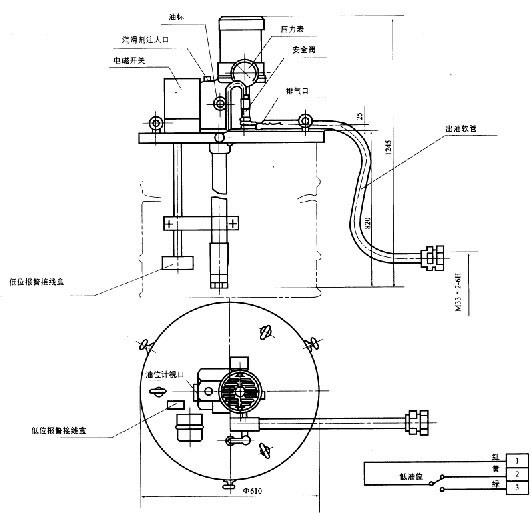 6、本泵設(shè)有低位報警裝置,報警后應(yīng)及時地向油筒內(nèi)充填潤滑脂。 |