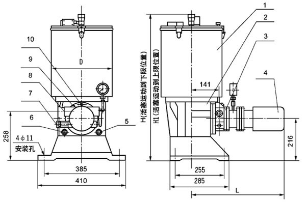1、貯油筒;2、泵座;3、帶連結(jié)法蘭的柱塞泵裝置;4、減速電機(jī)5、加油口G3/4;