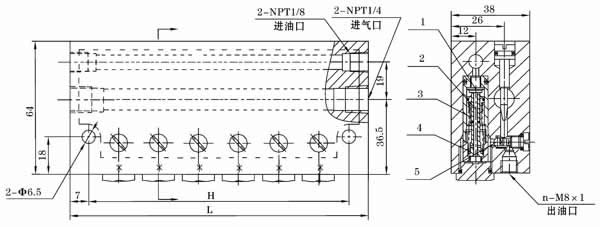 | 從進(jìn)油口處進(jìn)入的壓力油,在油壓的作用下件1下移,緊貼在件2上端面封住了通油通道,同時(shí)打開了進(jìn)油通道向件3上腔充油,件3在油壓作用下克服件4彈簧力向下移動(dòng),則件3下腔的油頂開件5進(jìn)入混合腔,在壓縮空氣的作用下經(jīng)混合后的油氣從油氣出口排出。供油主管卸荷后,件1上部油壓低并且件3在件4的作用下向上回位,件3上腔充入的油經(jīng)已打開的件2上端面流道孔進(jìn)入件3下腔儲(chǔ)存,為下一循環(huán)供油作好準(zhǔn)備。各口的供氣量可通過節(jié)流螺絲的開口大小進(jìn)行調(diào)節(jié)。 |